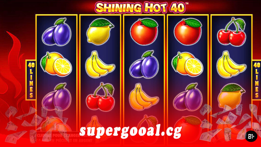 Shining Hot 40 est une machine à sous développée par le studio Pragmatic Play. Elle comporte 5 rouleaux, 4 rangées et 40 lignes de paiement. Le thème du jeu associe plusieurs catégories distinctes (thème classique, thème des fruits, et celui du feu). Les symboles réguliers sont composés de fruits tels que les pommes, les oranges, les prunes, les cerises, les citrons ou les bananes. Il y a aussi des chiffres, précisément des 7, qui redonnent le côté classique au jeu. Supergooal sans relâche, met à votre disposition et sans contrainte aucune, les jeux et promotions. Vous pouvez faire partie des heureux millionnaires à travers votre compte personnel ! Inscrivez-vous donc sur notre site maintenant et faites-vous sans limite du plaisir, un plaisir responsable !