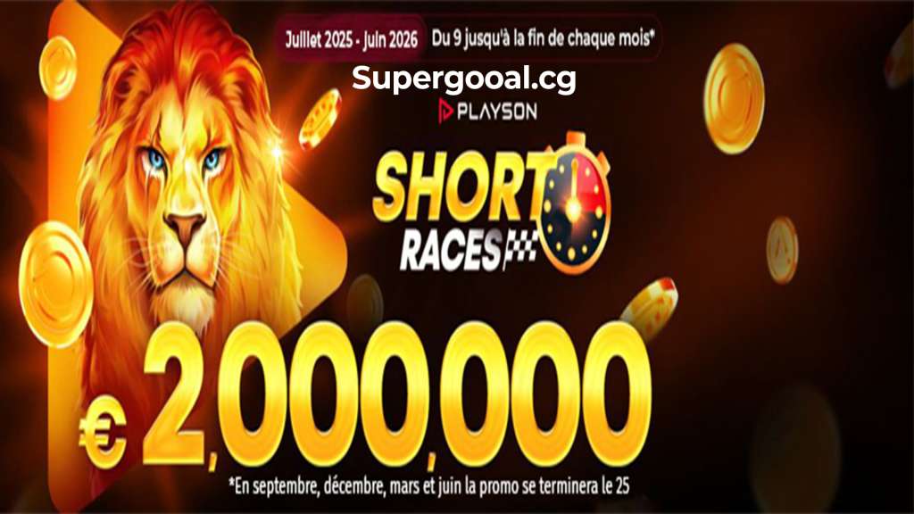 L’événement Playson Short Races de 100 000 € est disponible uniquement en mode réel. La mise minimale requise pour participer est de 0,20 EUR ou une devise équivalente. Chaque victoire contribuera au score total du joueur qui sera affiché dans le classement. Le score total est calculé en additionnant les points marqués pendant tous les tours joués dans les jeux participants pendant la période du tournoi. Les points sont calculés tour par tour, où chaque 1 EUR (ou devise équivalente) gagné équivaut à 10 points. Par exemple, 10 EUR gagnés représentent 100 points.  Les prix en espèces seront crédités sur les comptes des joueurs sous forme de fonds retirables dans les 72 heures (3 jours ouvrables) après la fin de la promotion. La cagnotte et la mise minimale de cette campagne sont fixées en EUR et peuvent être soumises aux fluctuations de conversion des devises. Les taux de conversion des devises sont fixés automatiquement par notre système 72 heures avant le début du tournoi, et les valeurs resteront les mêmes pendant toute la durée du tournoi.  Nous nous réservons le droit d’annuler les scores ou de ne pas verser un prix lorsque tout ou partie du score résulte d’une erreur évidente, d’une faute ou d’un défaut technique (y compris des paiements de jeu incorrects), qu’il soit causé par une erreur machine ou humaine concernant l’un des jeux participants. Nous nous réservons également le droit d’annuler les scores ou de ne pas verser un prix lorsque, à notre avis, tout ou partie du score résulte d’une tricherie ou d’une collusion avec d’autres joueurs. Nous nous réservons le droit de modifier ou d’annuler la campagne à tout moment. Supergooal sans relâche, met à votre disposition et sans contrainte aucune, les jeux et promotions. Vous pouvez faire partie des heureux millionnaires à travers votre compte personnel ! Inscrivez-vous donc sur notre site maintenant et faites-vous sans limite du plaisir, un plaisir responsable !