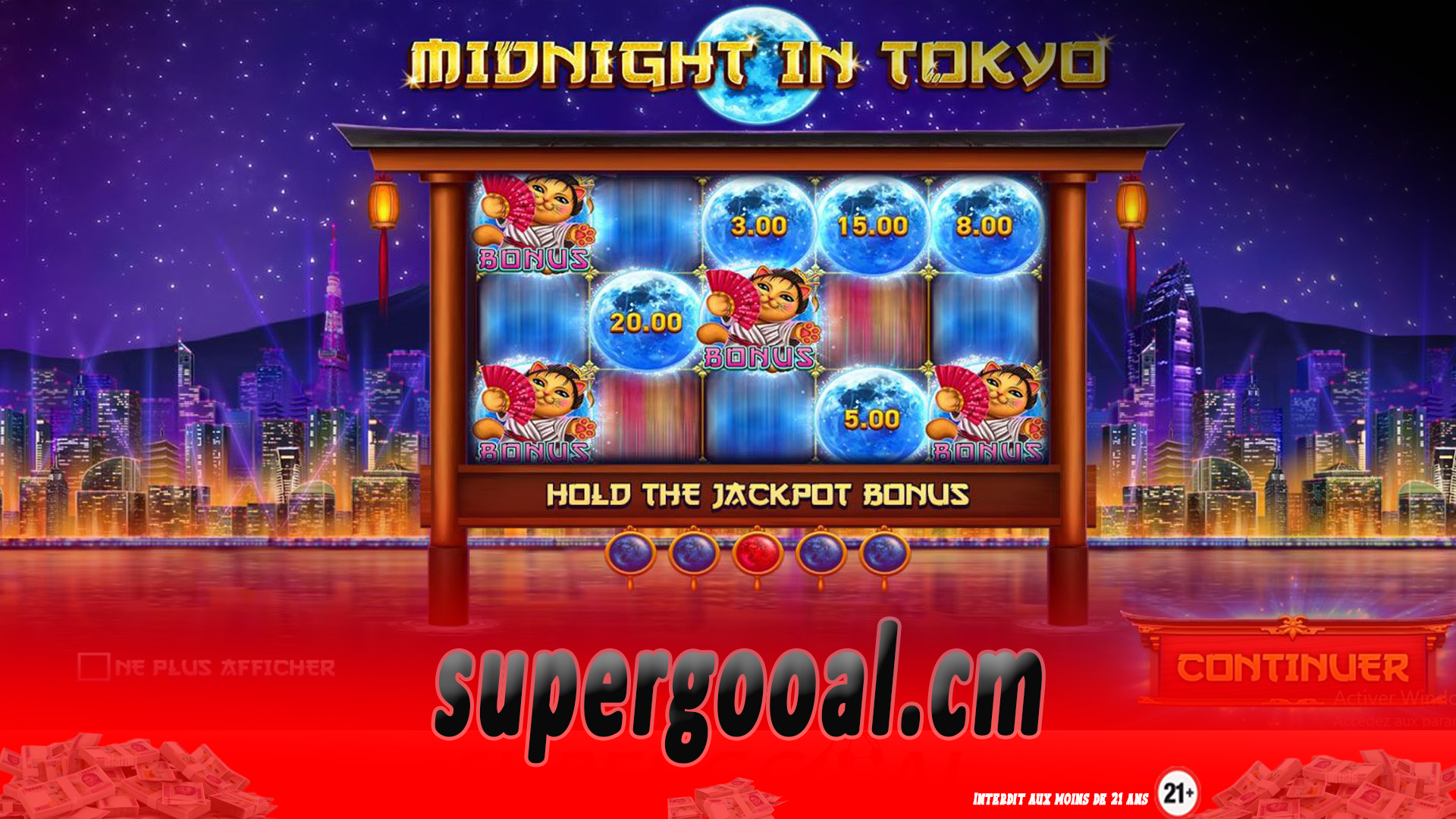 Les symboles les moins rémunérateurs du jeu Midnight in Tokyo sont J, Q, K et A. Si vous obtenez 5 types de symboles identiques, cela donne entre 0,4X et 1,2X la mise. Les symboles les plus rémunérateurs sont des pièces d’or qui représentent un poisson, un arbre, un hibou et une fleur. Si vous obtenez 5 types de symboles identiques, cela donne entre 1,5X et 10X la mise. Vous pouvez obtenir 2 symboles wild différents pendant les tours qui montrent les chats ninja et kung-fu. Le symbole scatter est constitué du chat geisha et vous pourrez également faire atterrir des symboles lunaires remplis de prix glorieux. Supergooal ne cesse de vous offrir, sans aucune contrainte, les jeux et les promotions. Vous avez la possibilité de rejoindre les chanceux millionnaires grâce à votre compte personnel ! Inscrivez-vous donc dès à présent sur notre site et profitez sans restriction de plaisir, un plaisir responsable !